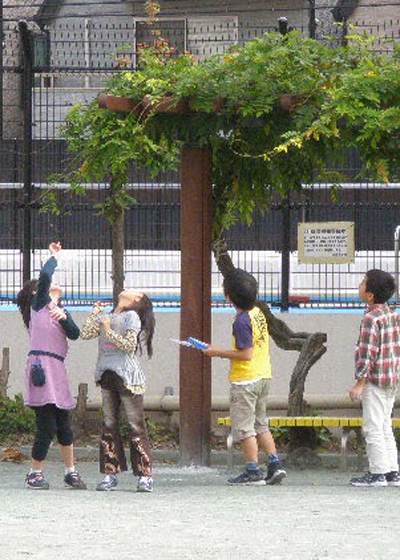 学校にある自然で、季節さがしの始まりです。 グループに分かれて、「形かたちさがし」に出発。いままであまり気にすることのなかった自然の中の形に目を向けることで、その見え方や自然に関する気づきがより豊かなものになります。 豊かな感性は季節の移り変わりによる小さな変化を感じていきます。一生懸命さがす目の輝き、自分たちだけの発見をした時の喜びは、このプログラム最大の魅力です。