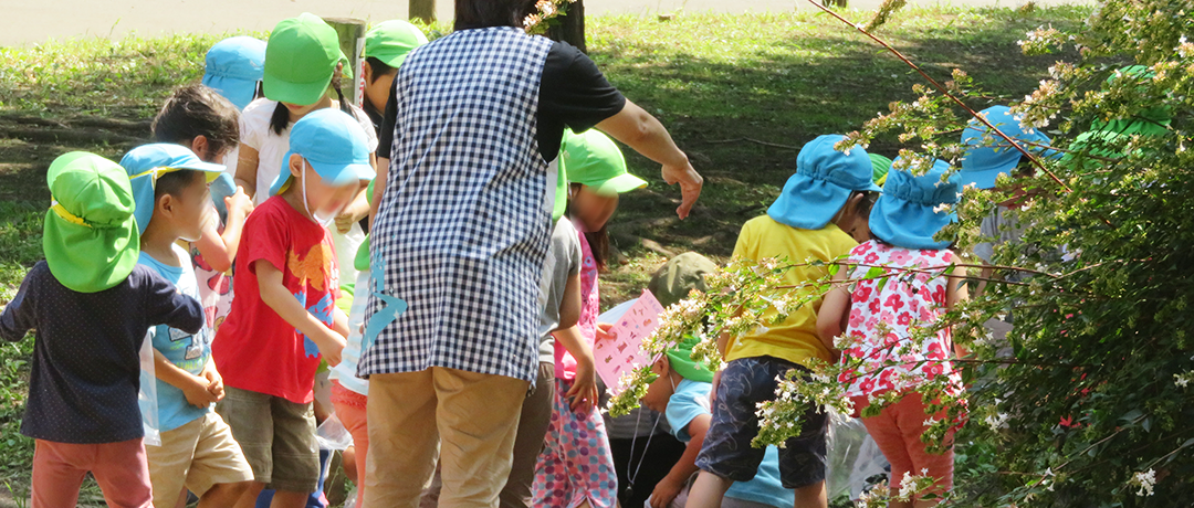 紙芝居「はらっぱかくれんぼ」の読み聞かせのあとは、オリジナルのいきものビンゴカードを使い、生き物とその暮らしに関わる探し物をしていきます。見つけた生きものを紹介しながら、周りの環境とどのように関わっているのか、どんなところに住んでいるのか、ペープサートでのふりかえりなどを通じて考えることができるプログラムです。